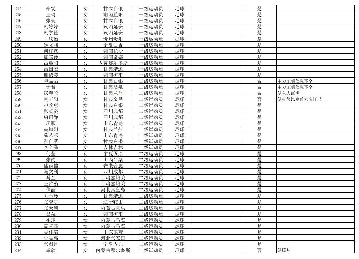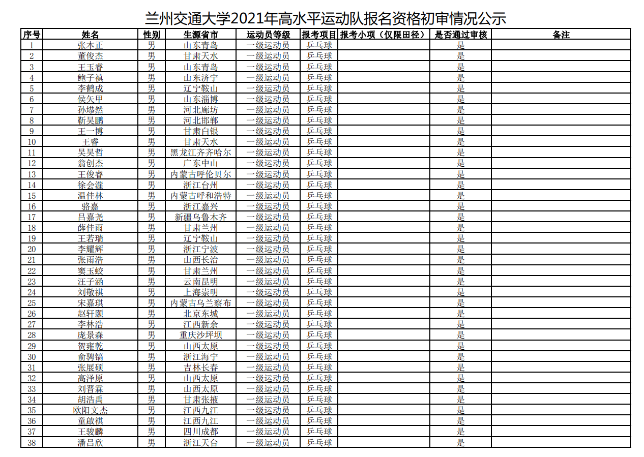 按照《兰州交通大学2021年高水平运动队招生简章》、《兰州交通大学2021年高水平运动队招生考试专项测试及疫情防控工作的补充通知》等通知精神,我校高水平运动队招生工作组组织专家对报考考生提交的报名材料进行了资格初审,现将资格初审结果公示如下。